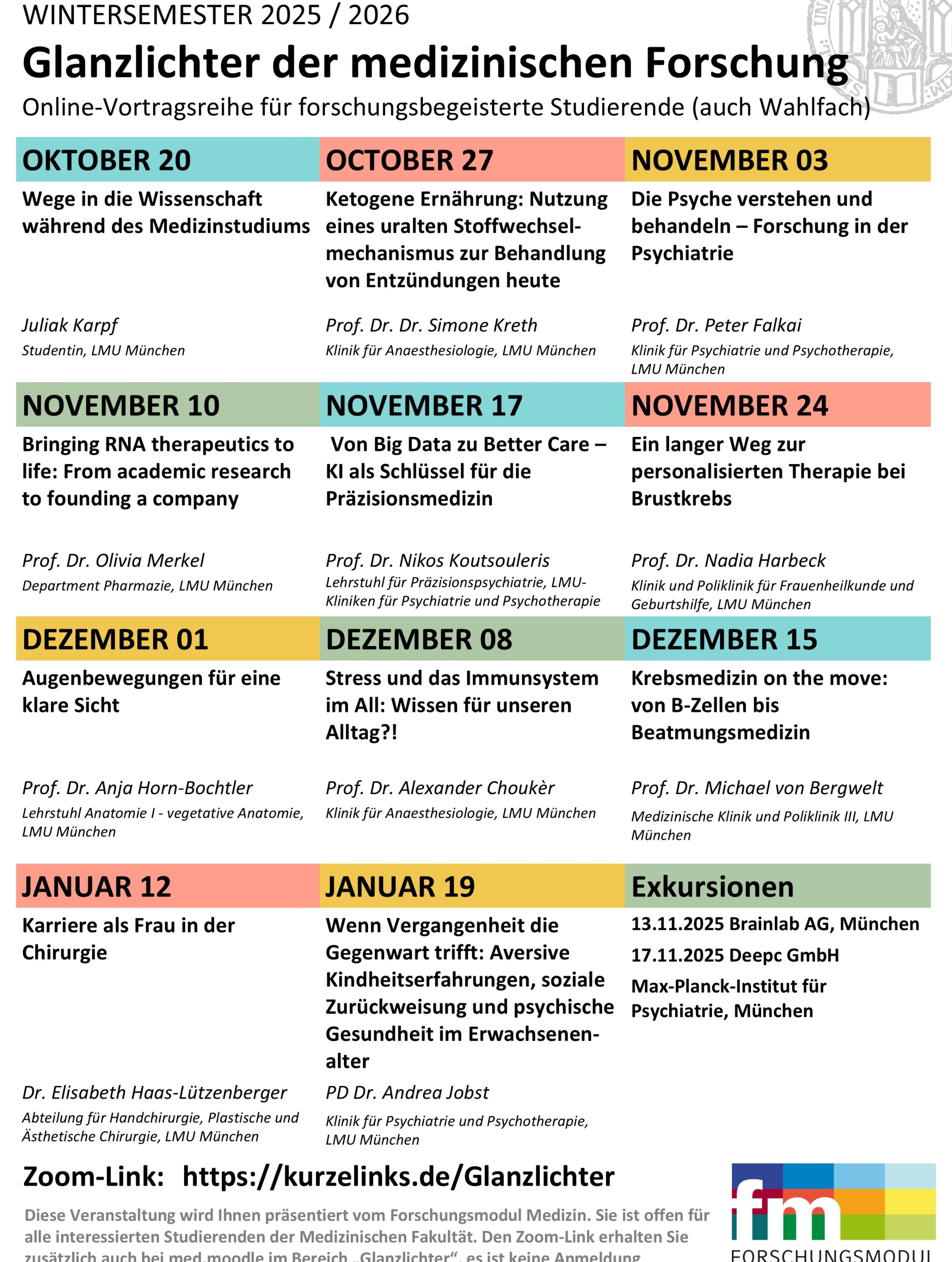 Die Vortragsreihe findet jährlich im Wintersemester statt. Den Zoom-Link finden Sie in med.moodle sowie auf den Programmplakaten.