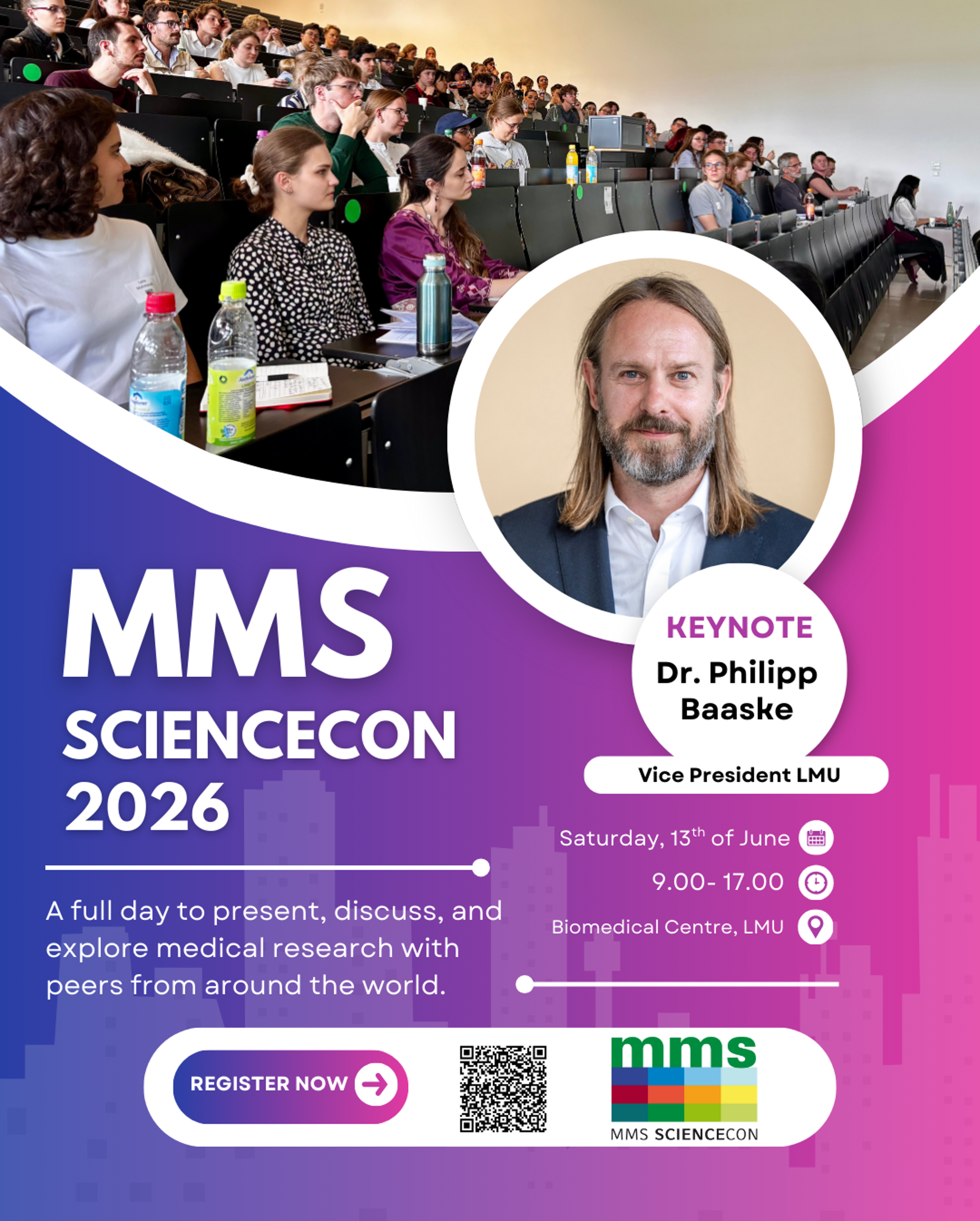 Die MMS ScienceCon ist eine studentische Konferenz für alle Studierenden der Humanmedizin, Zahnmedizin, Epidemiologie und Public Health. Die ScienceCon findet jedes Jahr im Juni am BMC der LMU München statt und ist auch offen für Studierende anderer Universitäten.